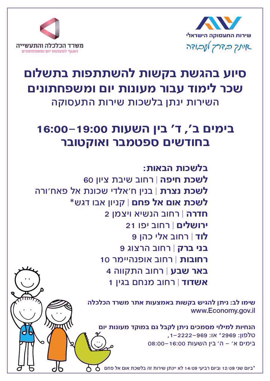 סיוע בהגשת בקשות להשתתפות בתשלום שכר לימוד עבור מעונות יום ומשפחתונים השירות יינתן בלשכות שירות התעסוקה בימים ב', ד' בין השעות 16:00-19:00 בחודשים ספטמבר ואוקטובר בלשכת  באר שבע | רחוב התקווה 4 שימו לב, ניתן להגיש בקשות באמצעות אתר משרד הכלכלה www.Economy.gov.il הנחיות למילוי מסמכים ניתן לקבל גם במוקד מעונות יום טלפון: *2969 או 1-2222-969 בימים א'-ה' בין השעות 08:00-16:00 8891f4ed-1b69-483f-9155-57c6a0a93b9f