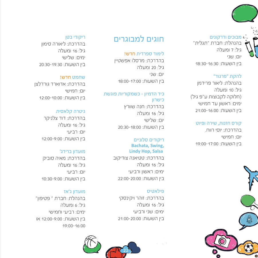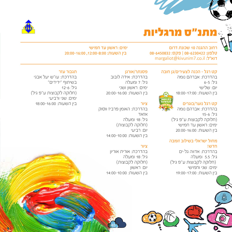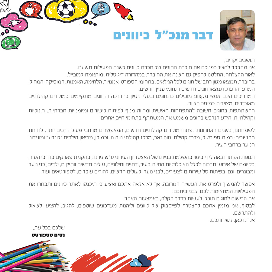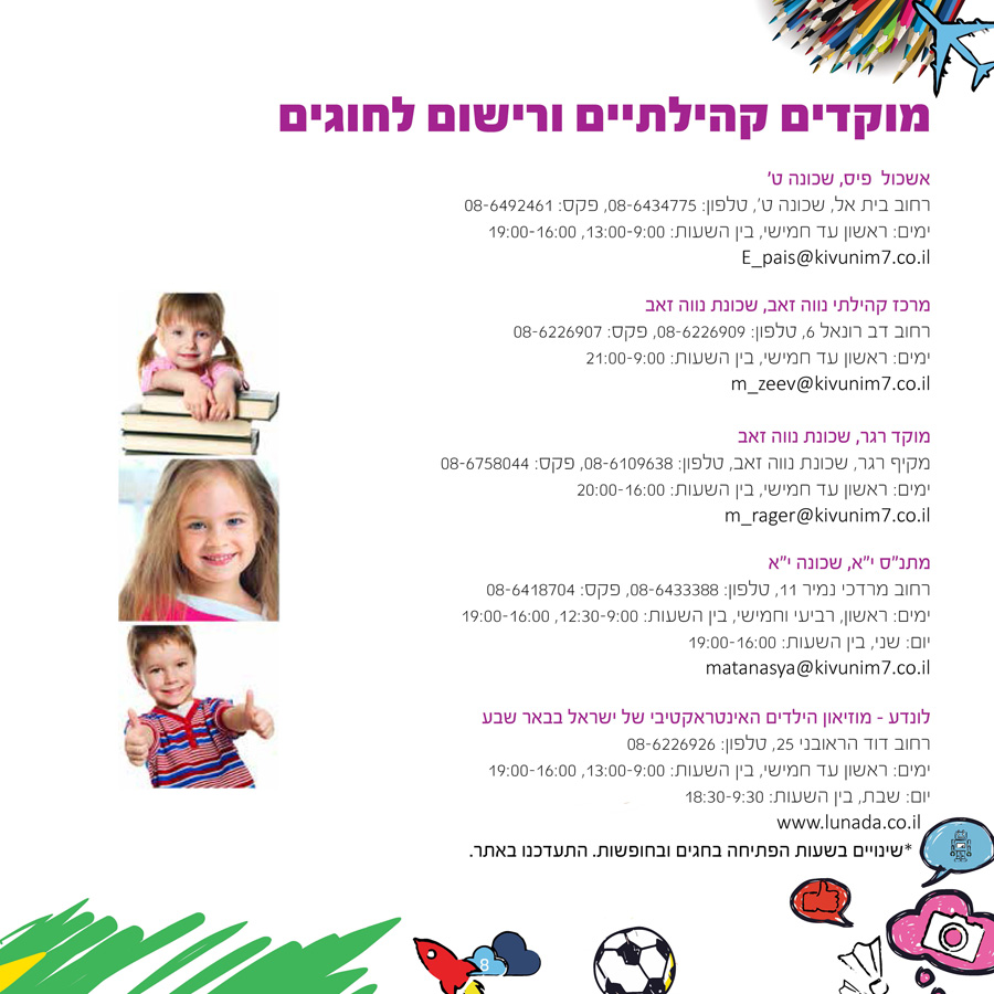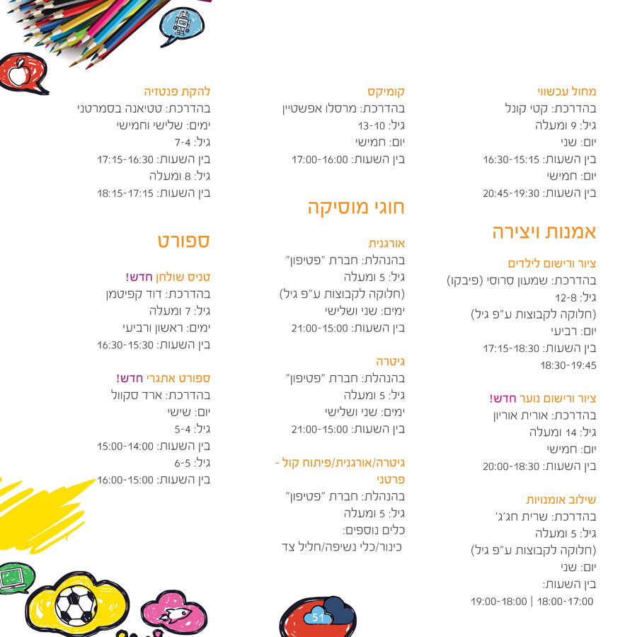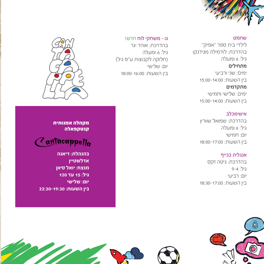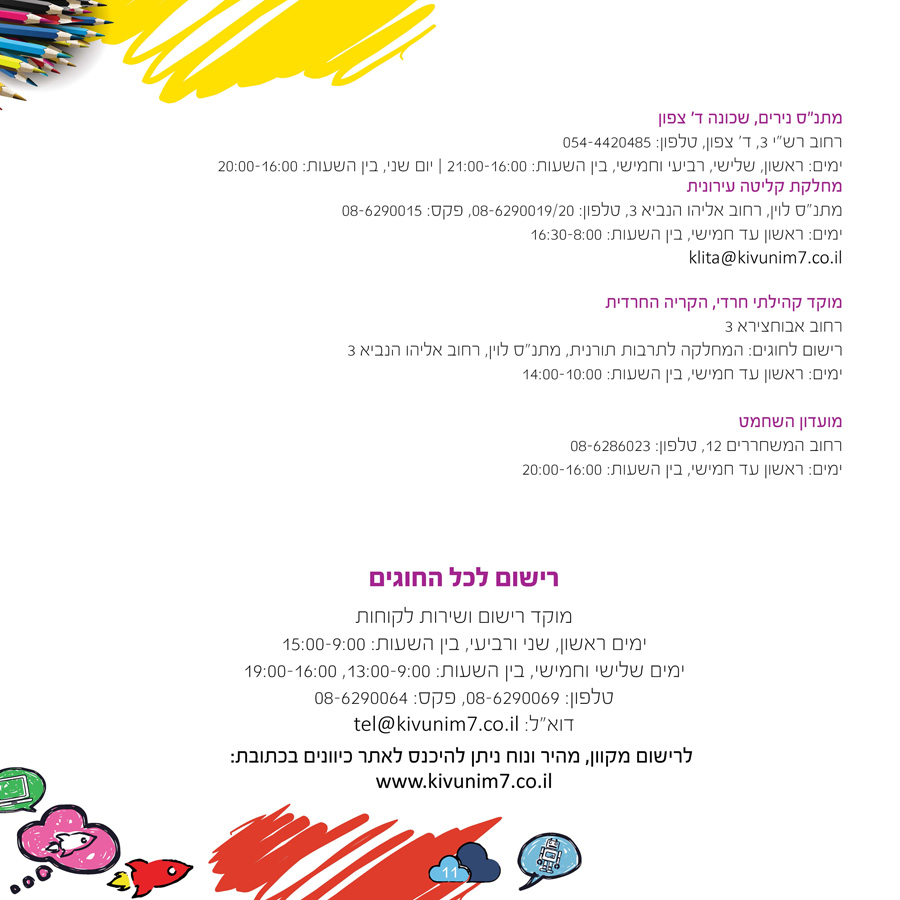 בחוברת שלפניכם תוכלו למצוא מידע מקיף על חוגים לילדים, נוער ומבוגרים במוקדים קהילתיים ברחבי העיר.