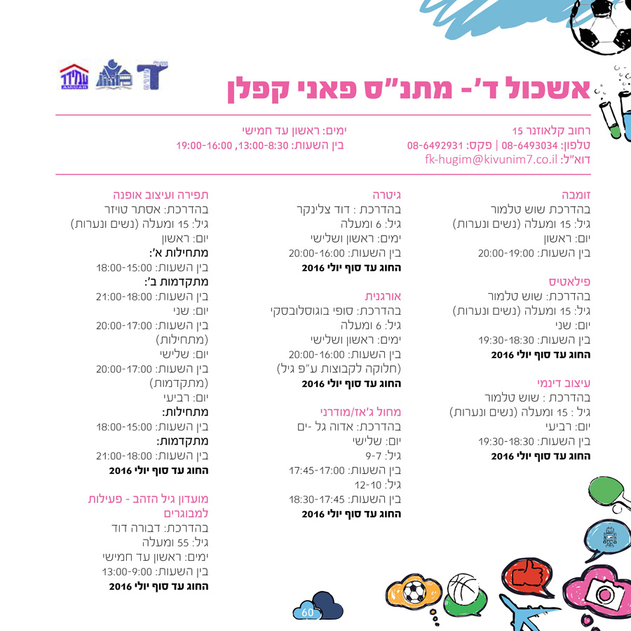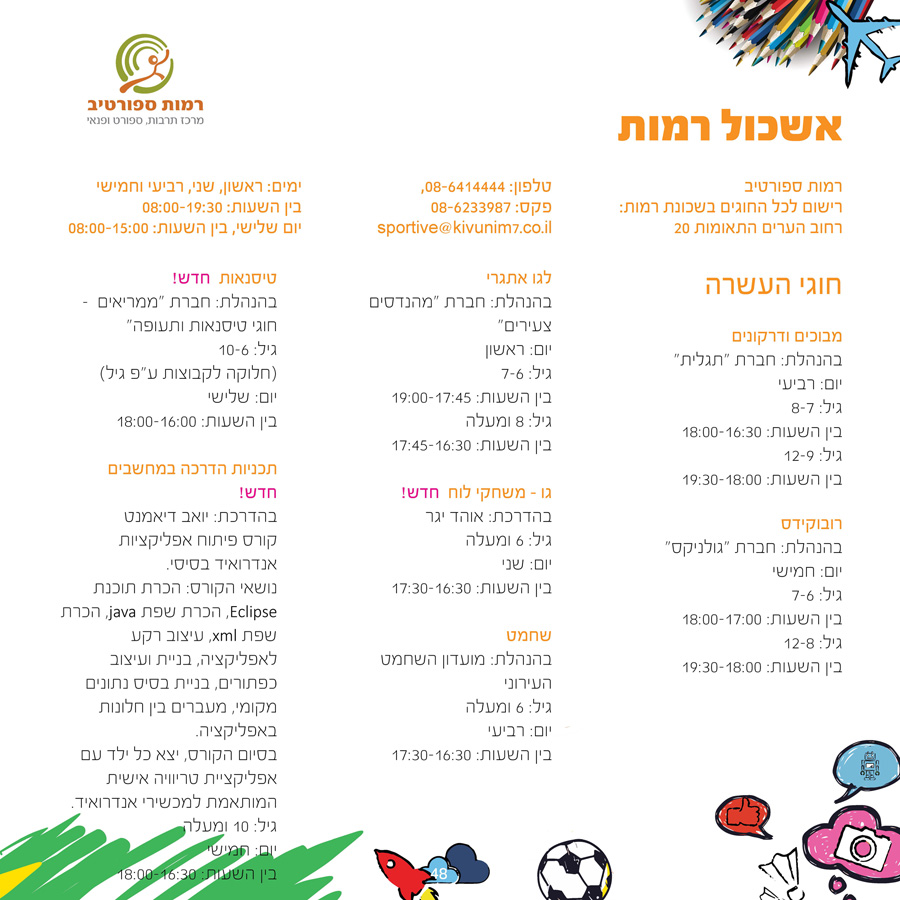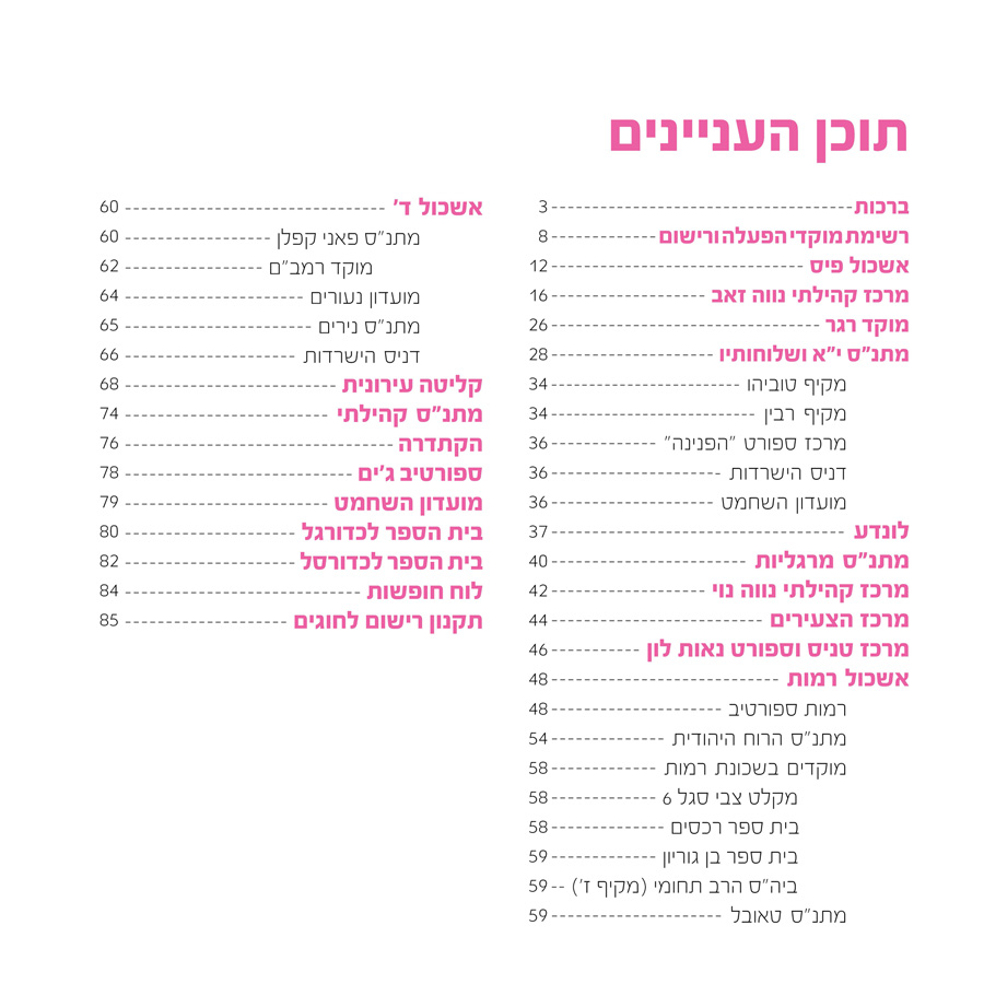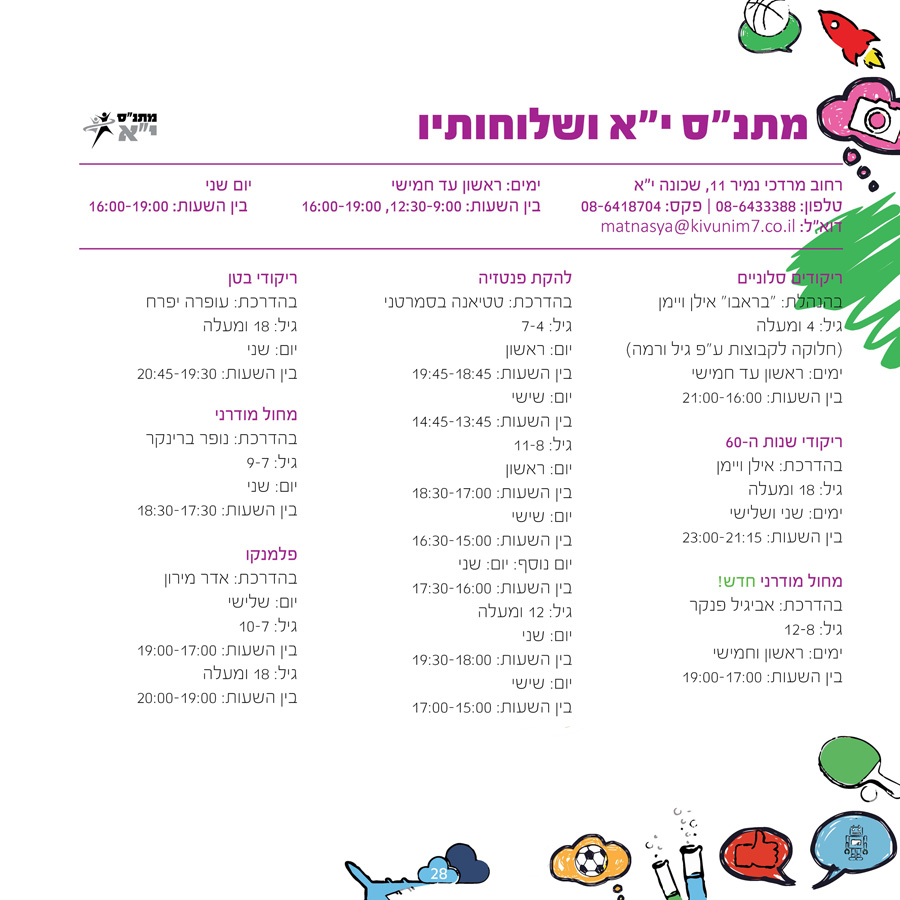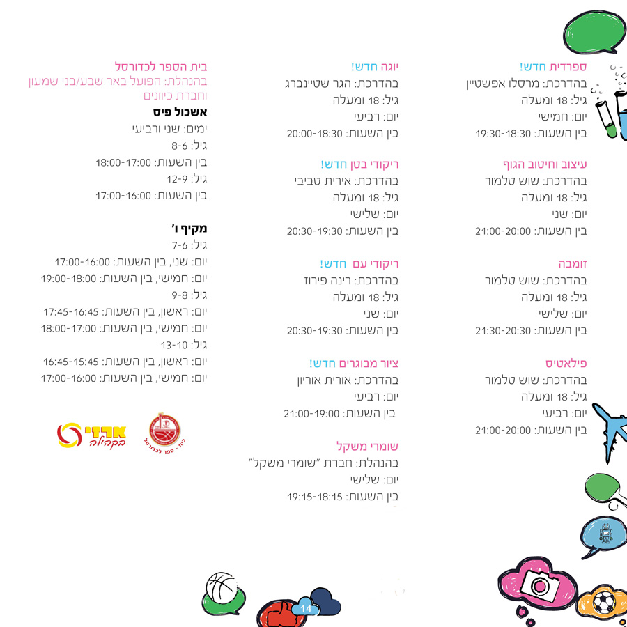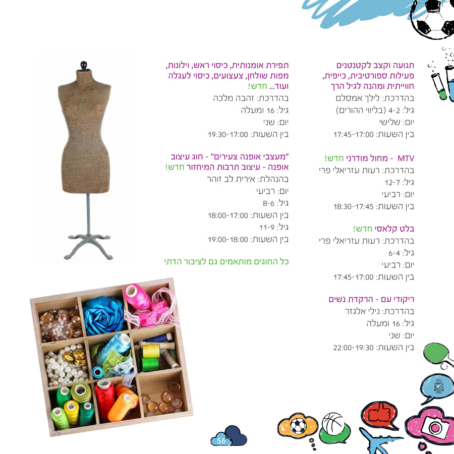 בחוברת שלפניכם תוכלו למצוא מידע מקיף על חוגים לילדים, נוער ומבוגרים במוקדים קהילתיים ברחבי העיר.