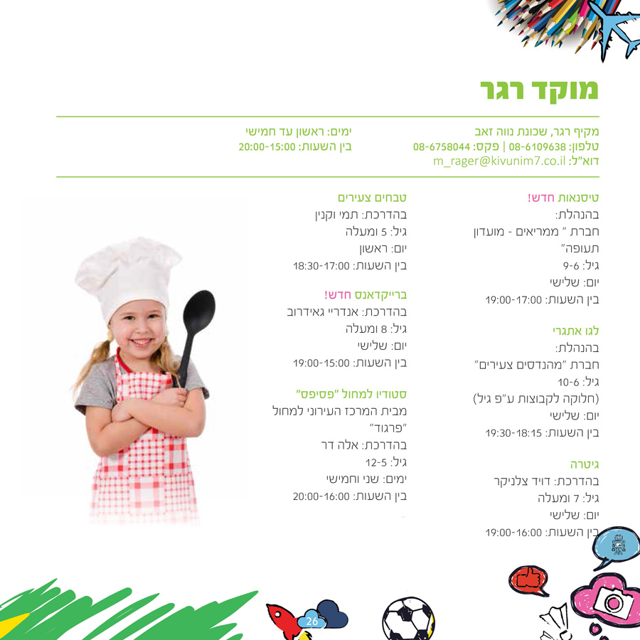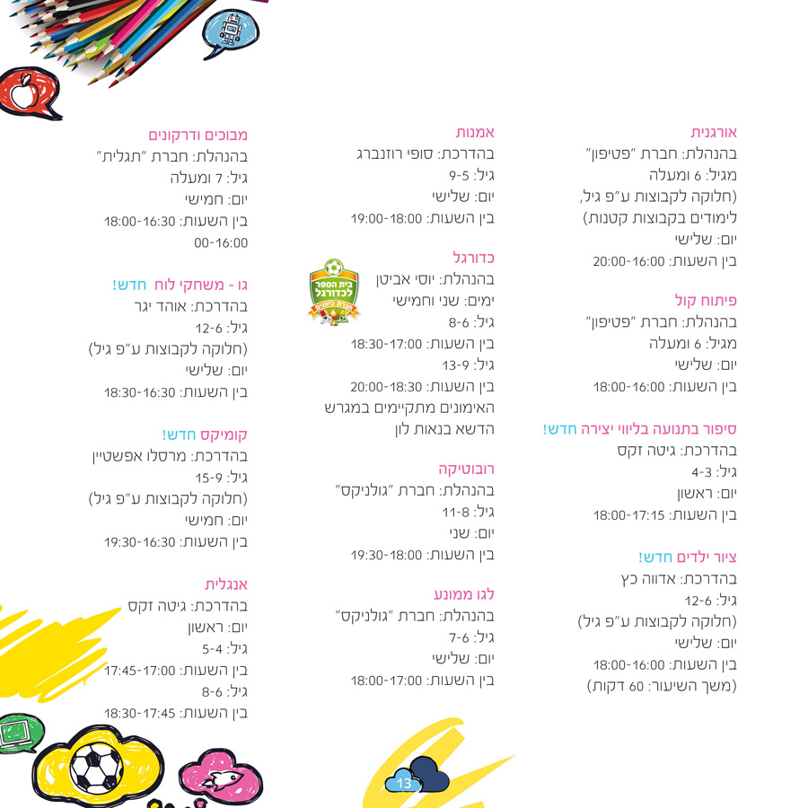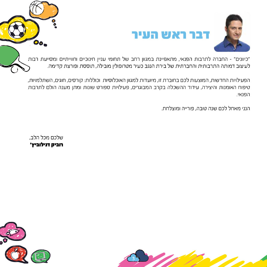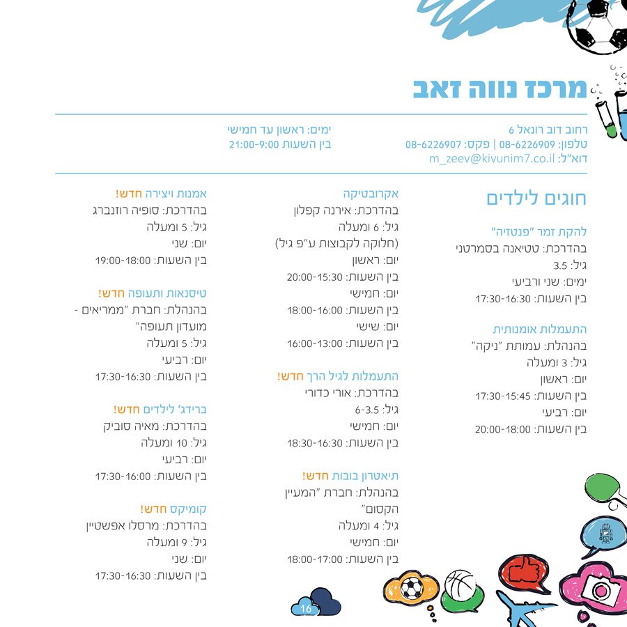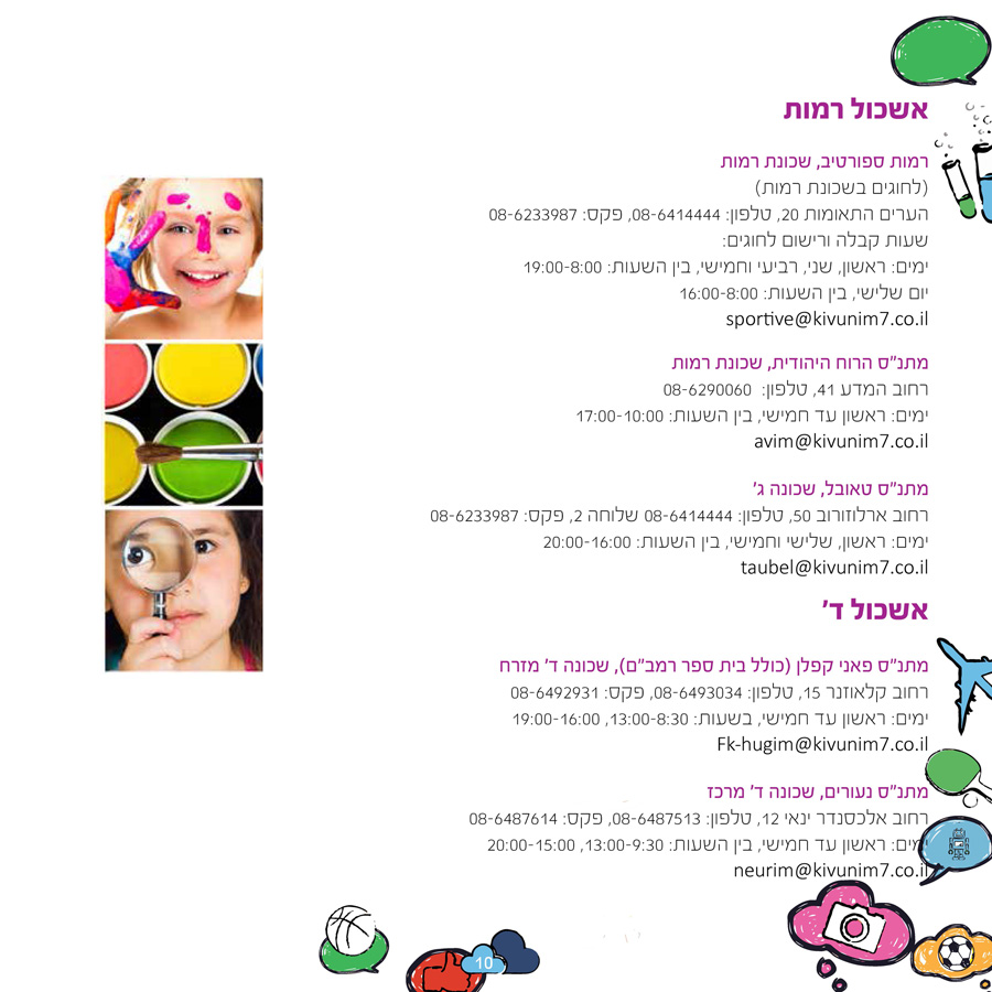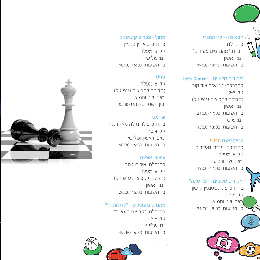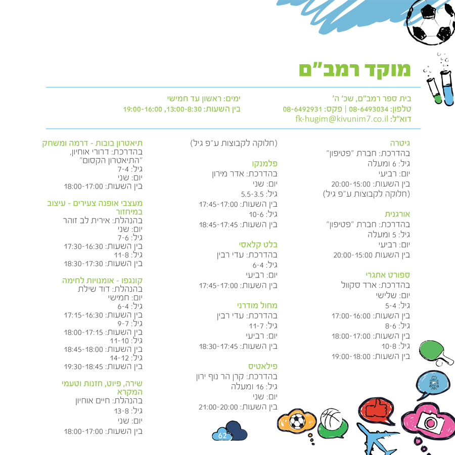בחוברת שלפניכם תוכלו למצוא מידע מקיף על חוגים לילדים, נוער ומבוגרים במוקדים קהילתיים ברחבי העיר.
