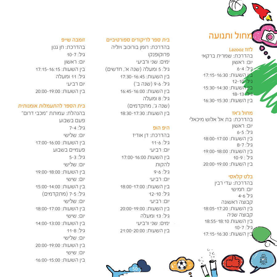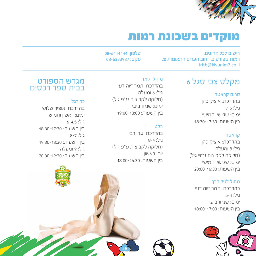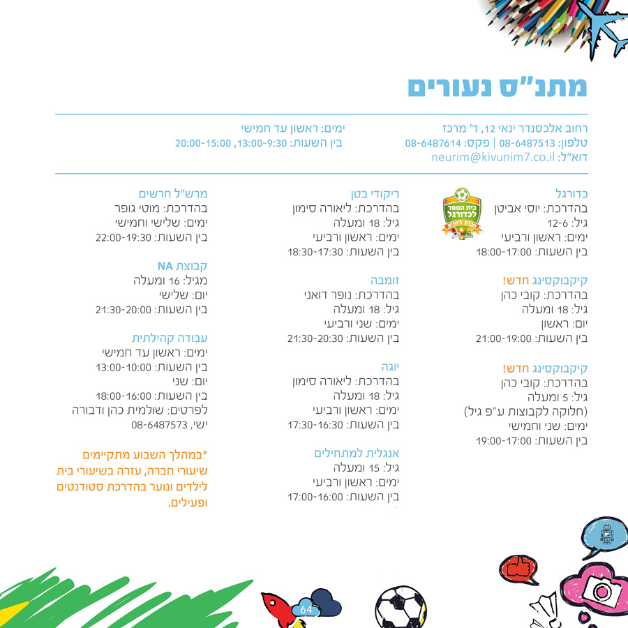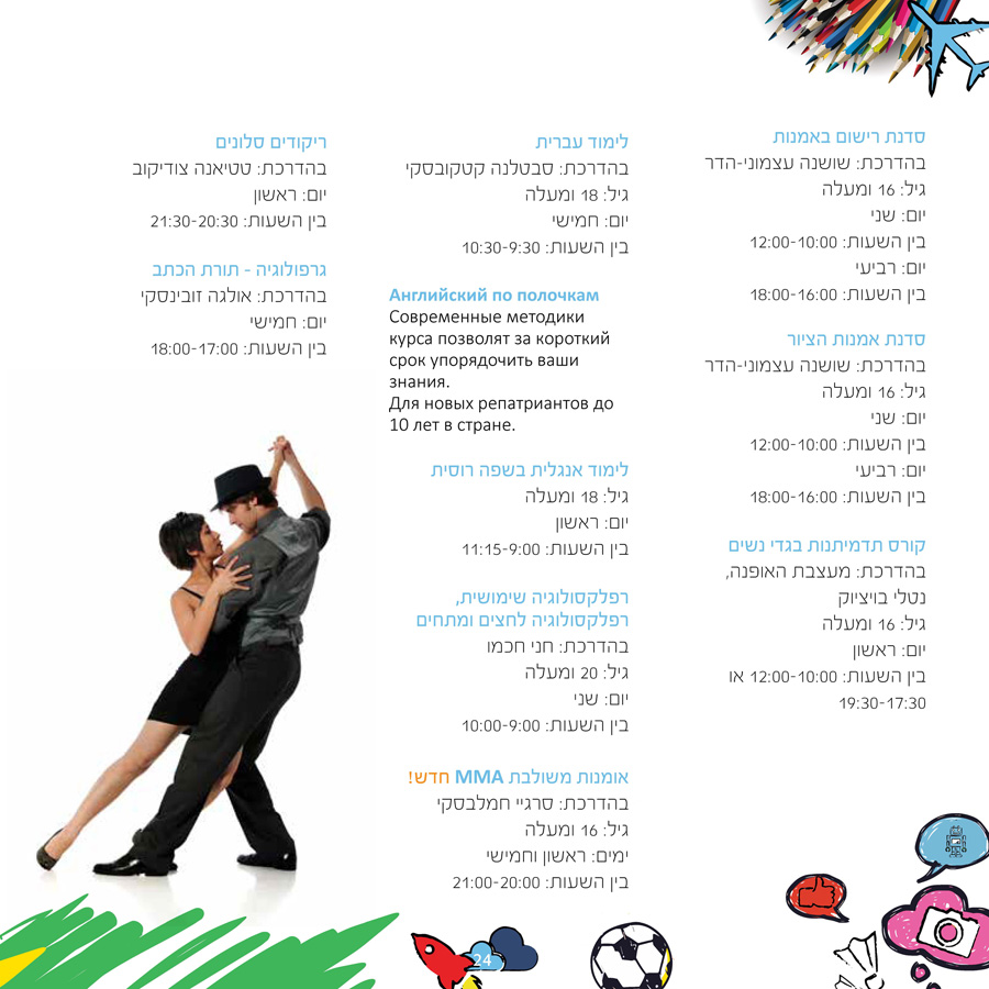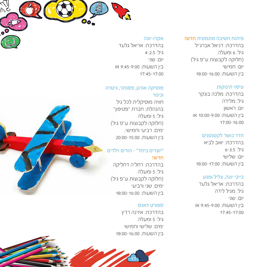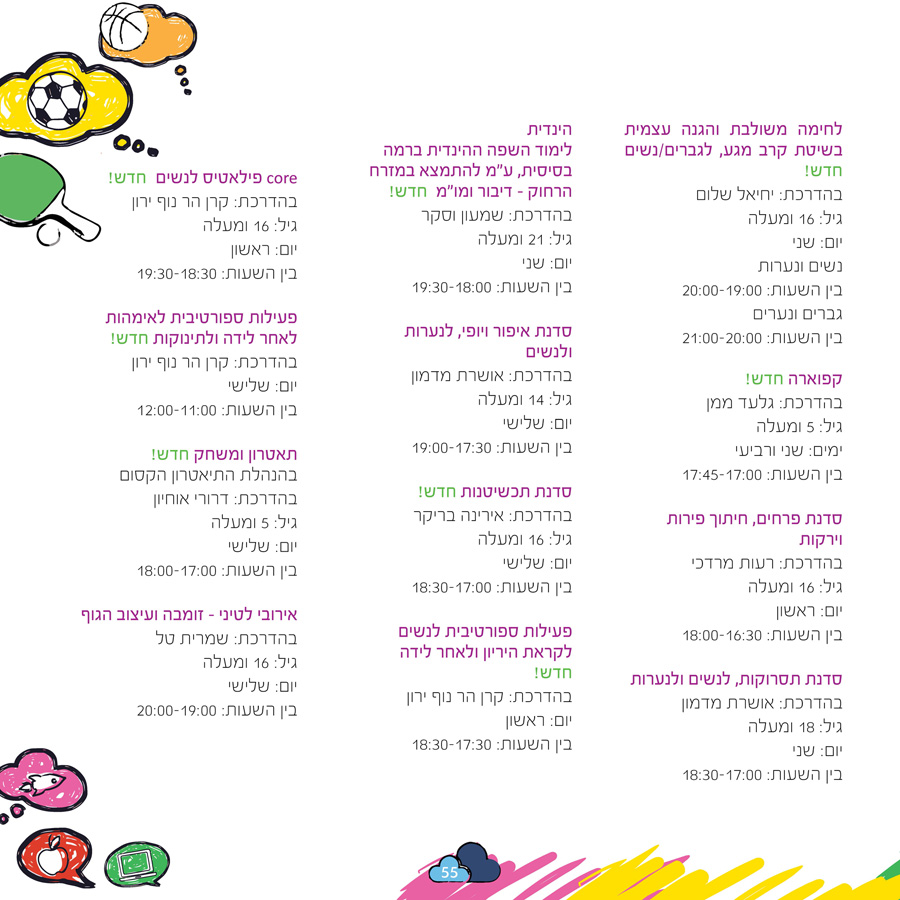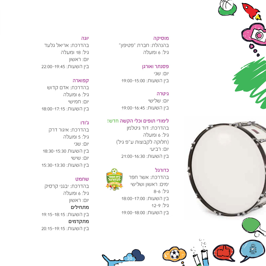 בחוברת שלפניכם תוכלו למצוא מידע מקיף על חוגים לילדים, נוער ומבוגרים במוקדים קהילתיים ברחבי העיר.